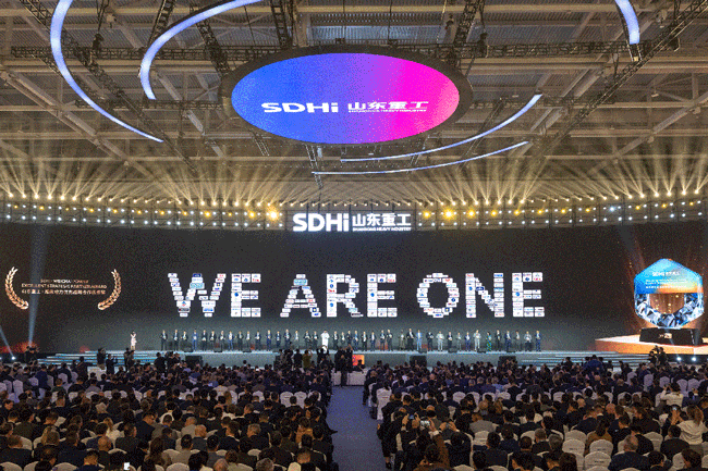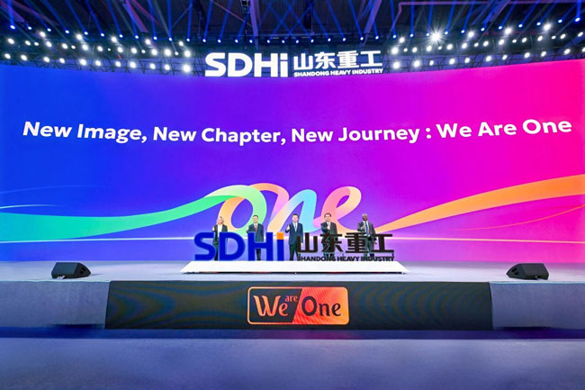 大會(huì)正式發(fā)布山東重工全球品牌標(biāo)識(shí),任剛、滿慎剛、王志堅(jiān)和戰(zhàn)略合作伙伴代表、海外員工代表共同為品牌標(biāo)識(shí)揭幕。